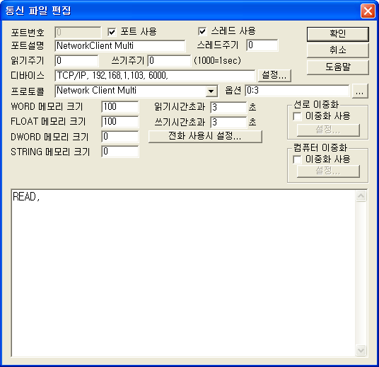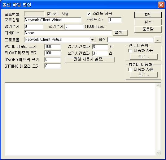 À§ÀÇ ¼³Á¤¿¡¼ º¸¸é Device´Â NoneÀ¸·Î ¼³Á¤µÇ¾î ÀÖ°í ÇÁ·ÎÅäÄÝÀº Network Client VirtualÀ¸·Î ¼³Á¤µÇ¾î ÀÖ´Ù. Network Client Multi·Î ¼³Á¤ÇÑ ´ÙÀ½ Æ÷Æ®¿¡ Network Client Virtual·Î ¼³Á¤À» ÇÏ¸é ¼¹öÃøÀÇ ±âÁØÆ÷Æ®(¿©±â¼´Â 0¹ø Æ÷Æ®)ÀÇ ´ÙÀ½ Æ÷Æ®(1¹ø Æ÷Æ®)ÀÇ µ¥ÀÌÅͰ¡ ÀúÀåµË´Ï´Ù. À̶§ 1¹ø,2¹ø,3¹ø Æ÷Æ®´Â ½ÇÁ¦ Åë½ÅÀ» ÇÏÁö ¾Ê°í 0¹ø Æ÷Æ®¸¦ ÅëÇÏ¿© Åë½ÅÀ» ÇÏ°Ô µÈ´Ù.(Åë½Å Ƚ¼ö°¡ Áõ°¡ÇÏÁö ¾Ê´Â´Ù.)