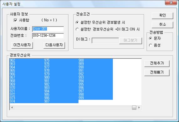 »ç¿ëÀÚ ¼³Á¤À» ÇÔÀ¸·Î½á °æº¸ ¸Þ½ÃÁö¸¦ º¸³¾ »ç¿ëÀÚ µî·ÏÀ» ÇÒ ¼ö ÀÖ´Ù. ¿©±â¼ »ç¿ëÀÚÀÇ ÇÚµåÆù ¹øÈ£¿Í ¸Þ½ÃÁö¸¦ ¹ß»ýÇÒ °æº¸ÀÇ ¿ì¼±¼øÀ§¸¦ ¼±ÅÃÇÑ´Ù.