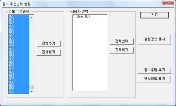 °æº¸ ¿ì¼±¼øÀ§ »ç¿ëÀÚ¸¦ ¼±ÅÃÇÏ°í ¼³Á¤°æº¸ Ç¥½Ã ¹öưÀ» ´©¸£°Ô µÇ¸é ÇöÀç ¼±ÅÃÇÑ »ç¿ëÀÚ¿¡ ´ëÇØ¼ °æº¸ ¿ì¼±¼øÀ§¸¦ º¸¿©ÁØ´Ù.
