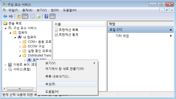 <±×¸² 28>ÀÇ È¸é°ú °°ÀÌ "ÄÜ¼Ö ·çÆ® | ±¸¼º ¿ä¼Ò ¼ºñ½º | ÄÄÇ»ÅÍ | Distributed Transaction Coordinator"¿¡¼ ¸¶¿ì½º ¿ìÃø ¹öưÀ» ÀÌ¿ëÇÏ¿© "¼Ó¼º"À» ¼±ÅÃÇÏ¿© <±×¸² 29> ~ <±×¸² 31>±îÁöÀÇ È¸é°ú °°ÀÌ ¼³Á¤À» ¿Ï·áÇÑ´Ù.