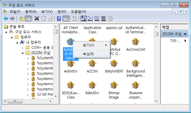 <±×¸² 31>±îÁö ¼³Á¤ÀÌ ¿Ï·áµÇ¸é, <±×¸² 32>¿Í °°ÀÌ DCOM ¸ñ·Ï¿¡¼ "AutoBase In-Proc Server" Ç׸ñ¿¡¼ ¸¶¿ì½º ¿ìÃø ¹öưÀ» ÀÌ¿ëÇÏ¿© "¼Ó¼º"À» ¼±ÅÃÇÑ´Ù.