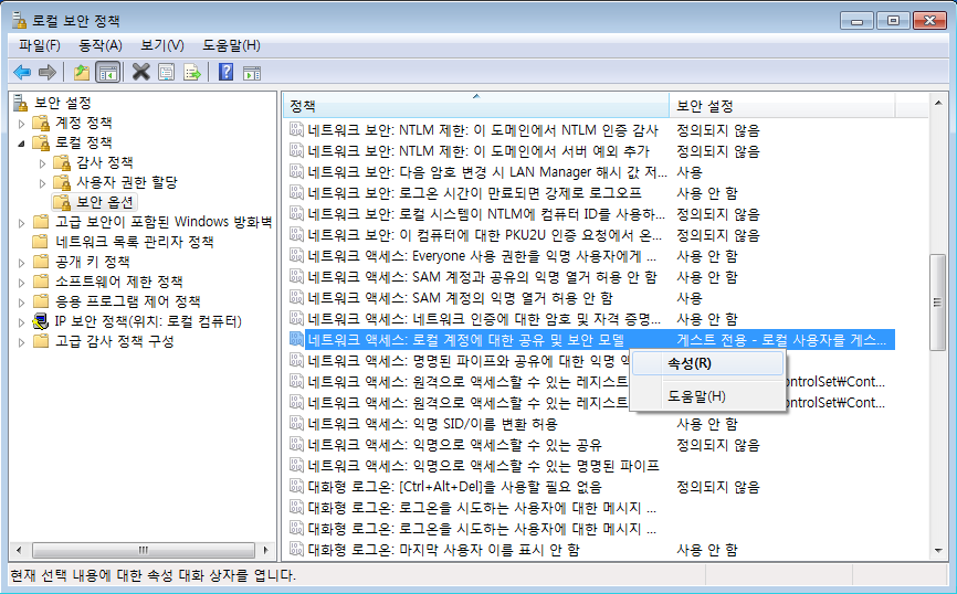 ·ÎÄà º¸¾È ¼³Á¤ ÇÁ·Î±×·¥¿¡¼ "º¸¾È ¼³Á¤ | ·ÎÄà Á¤Ã¥ | º¸¾È ¿É¼Ç"¿¡¼ "³×Æ®¿öÅ© ¾×¼¼½º : ·ÎÄà °èÁ¤¿¡ ´ëÇÑ °øÀ¯ ¹× º¸¾È" ºÎºÐÀ» ¸¶¿ì½º ¿ìÃø ¹öưÀ» ´·¯¼ "¼Ó¼º" Ç׸ñÀ» ¼±ÅÃÇÑ´Ù.