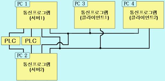 <±×¸² 1>ÀÇ ¼¹ö/Ŭ¶óÀÌ¾ðÆ®´Â ´ÙÀ½°ú °°Àº ¹æ¹ýÀ¸·Î ¼³Á¤ÇÑ´Ù. ´Ü ¼¹ö1, ¼¹ö2ÀÇ 0¹ø, 1¹ø Åë½ÅÆ÷Æ®¿¡ PLC¿Í Åë½Å¼³Á¤ Çß´Ù°í °¡Á¤ÇßÀ» °æ¿ì