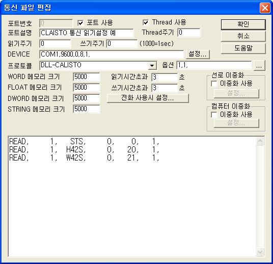 ¿¹1) Station : 1 Address : 0050 Extra1 : STS, EXTRA2 : 0 À¸·Î ¼³Á¤ÇÏ°í µðÁöÅÐ Ãâ·ÂÀ» Çϸé 1¹øÁö CALISTO ÀåºñÀÇ Status String ¸¦ ÀÐ¾î¼ 50 ¹øÁöºÎÅÍ WORD/DWORD/FLOAT/STRING ¸Þ¸ð¸®¿¡ ÀÐÀº °ªÀº ÀúÀåÇÑ´Ù.