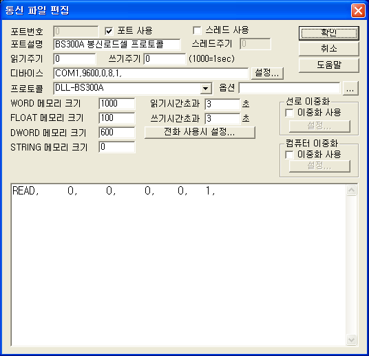 <±×¸² 1>ÀÇ DEVICE ¿µ¿ªÀº BS300A¿Í ¿¬°áÇÑ Åë½ÅÆ÷Æ®(COM1), Åë½Å¼Óµµ(9600 :°íÁ¤), Parity Bit(0), Data Bit(8), Stop Bit(1) ·Î ¼³Á¤ÇÑ´Ù.