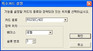 5. <±×¸² 9>¿¡¼ Ä«µåÁ¾·ù¸¦ RS232C/422·Î ¸ÂÃß°í ÀåÂøÀ§Ä¡¸¦ ÁöÁ¤(CPU ¸ðµâ ´ÙÀ½ºÎÅÍ 0, 1, 2¡¦ )ÇÏ°í ¡®È®ÀΡ¯ ¹öÅÏÀ» ´©¸£¸é <±×¸² 10>ÀÇ ´ëÈ»óÀÚ°¡ ³ªÅ¸³´Ù.
