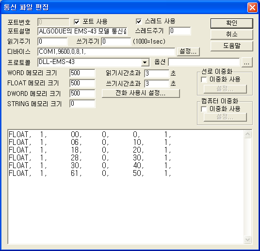 EMS-43ÀÇ Åë½Å¼Óµµ(300, 600, 1200, 2400,4800, 9600)¿Í ÆÐ¸®Æ¼ ºñÆ®(0, 1, 2), ½ºÅéºñÆ®(1, 2) µîÀº Commnication Parameter ¼³Á¤ ºÎºÐ¿¡¼ ÁöÁ¤ÇÑ °ªÀ» ÀÔ·ÂÇϰí Åë½Å¿¬°áÀ» 485·Î ÇÒ ¶§´Â TxRTS, RxECHO, 1200(Àбâ RTS ½Ã°£), 1200(¾²±â RTS ½Ã°£)À» ÁöÁ¤ÇÏ¿© ÁÖ¾î¾ß Åë½ÅÀÌ °¡´É(485Ä«µå¿¡ µû¶ó RTS ½Ã°£ µîÀÇ ¼³Á¤ÀÌ ´Ù¸§)ÇÏ´Ù.