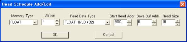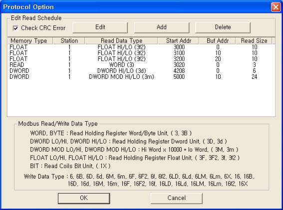 <±×¸² 3> MODBUS µå¶óÀ̺êÀÇ Åë½Å Àб⠼³Á¤ READ Ãß°¡/ÆíÁý ´ëÈ»óÀÚÀÇ ¿¹