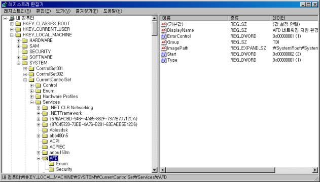 <±×¸² 2>¿¡¼´Â HKEY_LOCAL_MACHINE\SYSTEM\CurrentControlSet\Services\Afd ±îÁö´Â ±âÁ¸¿¡ »ý¼ºµÇ¾î Àִµ¥ Parameters\IgnorePushbitOnReceives ºÎºÐÀº Á¸ÀçÇÏÁö ¾ÊÀ½À» º¼ ¼ö ÀÖ´Ù.