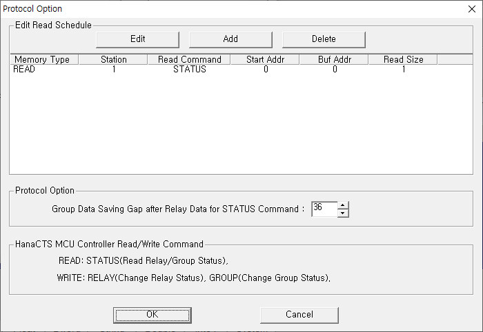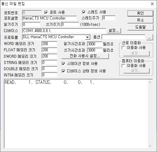 | <±×¸² 3> HanaCTS MCU Controller µå¶óÀ̹öÀÇ Åë½Å Àб⠼³Á¤ Ãß°¡/ÆíÁý ´ëÈ»óÀÚÀÇ ¿¹ |