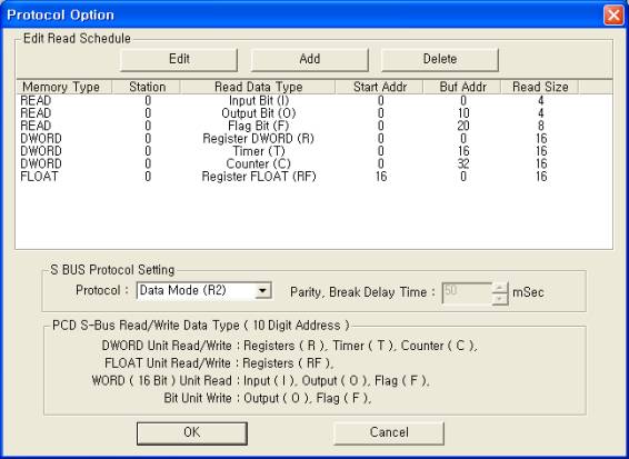 <±×¸² 3> PCD S-BUS µå¶óÀ̹öÀÇ Åë½Å Àб⠼³Á¤ READ Ãß°¡/ÆíÁý ´ëÈ»óÀÚÀÇ ¿¹