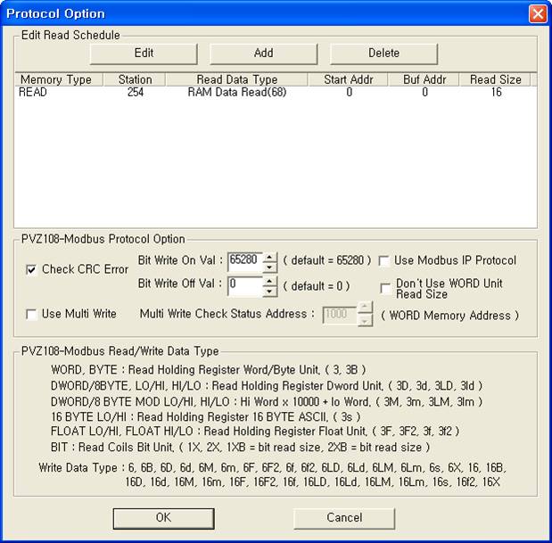 PVZ108-MODBUS Åë½Å µå¶óÀ̹öÀÇ ¿É¼Ç ºÎ ¿¡´Â ÀÐÀº ÆÐŶÀÇ CRC üũ ¿©ºÎ( 1 = üũ ÇÔ, 0 = üũ ¾ÈÇÔ ), ºñÆ® ON ¾²±â °ª ( ±âº» = 65280 ), PVZ108-MODBUS IP ÇÁ·ÎÅäÄÝ »ç¿ë¿©ºÎ( 1 = IP ÇÁ·ÎÅäÄÝ, 0 = ÀÏ¹Ý ½Ã¸®¾ó ÇÁ·ÎÅäÄÝ ) , ºñÆ® OFF ¾²±â °ª ( ±âº» = 0 ), DWORD/FLOAT µîÀÇ °ªÀ» ÀÐÀ» ¶§ ÀÐÀ» Å©±â¸¦ WORD ´ÜÀ§ ºñ »ç¿ë¿©ºÎ( 1 = »ç¿ë¾ÈÇÔ, 0 = WORD ´ÜÀ§·Î °è»ê, ±âº» : 0 ), ¸ÖƼ¾²±â »ç¿ë¿©ºÎ(0 = »ç¿ë¾ÈÇÔ, 1 = »ç¿ë, ±âº» : 0), µ¥ÀÌÅÍ °ª ºñ±³¸¦ À§ÇÑ »óŰª ÀúÀåÀ§Ä¡(WORD ¸Þ¸ð¸® ¹øÁöÁöÁ¤, ±âº» : 1000) ¼øÀ¸·Î ÄÞ¸¶( , )·Î ±¸ºÐÇÏ¿© ÀÔ·ÂÇÑ´Ù.