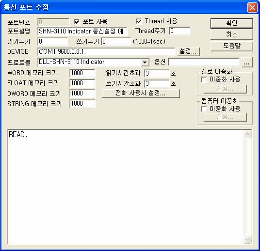 PORT : 0 STATION : 2 ADDRESS : 0000 EXTRA1 : 4 EXTRA2 : 2 ·Î ¼³Á¤ÇÏ°í ¾Æ³¯·Î±× Ãâ·ÂÀ» Çϸé 0 ¹ø Æ÷Æ®¿¡ ¿¬°áµÈ 1¹ø SHN-3110 (6ÀÚ¸®)Indicator¿¡ ¼³Á¤ÇÑ °ªÀ» ¼Ò¼öÁ¡ 2ÀÚ¸®·Î Ãâ·ÂÇÒ ¼ö ÀÖ´Ù.