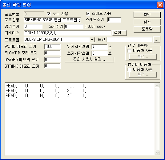 <±×¸² 1>Àº µ¶ÀÏ SIEMENS S5, S7 ±âÁ¾ PLC ÀÇ RS-232 ÇÁ·ÎÅäÄÝ ÁßÀÇ ÇϳªÀÎ 3964R À» »ç¿ëÇÒ ¶§ÀÇ Åë½Å ÇÁ·ÎÅäÄÝ ¼³Á¤ ¿¹Àε¥ DEVICE´Â PLC¿¡¼ ¼³Á¤ÇÑ´ë·Î 19200, 2, 8, 1, °ú °°ÀÌ ¸ÂÃá´Ù.