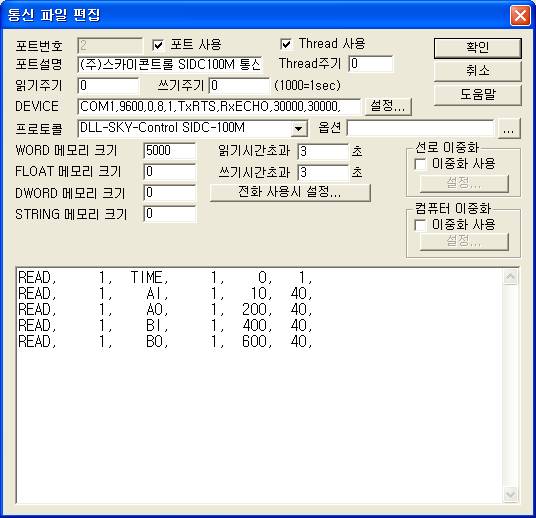 SIDC-100M ÄÁÆ®·Ñ·¯ÀÇ DEVICE ¼³Á¤Àº ¿¬°áµÈ Åë½ÅÆ÷Æ®, ¼Óµµ(9600 BPS), PARITY BIT(0), DATA BIT(8), STOP BIT(1) µîÀ» ÀÔ·ÂÇϰí 485 Åë½ÅÀÇ BACK ½ÅÈ£¸¦ ¹ÞÁö¾Ê°Ô TxRTS, RxECHO, 30000(Àбâ TRS end Delay) , 30000(¾²±â TRS end Delay) ¼øÀ¸·Î ÀÔ·ÂÇÑ´Ù.