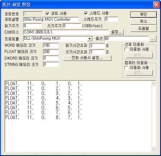 ShinPoong MUX ÄÁÆ®·Ñ·¯´Â 485 ¸¸À» »ç¿ëÇϱ⠶§¹®¿¡ DEVICE´Â ¼³Á¤ºÎºÐ¿¡ TxRTS, RxECHO µîÀÇ ¿É¼ÇÀ» »ç¿ëÇÑ´Ù.