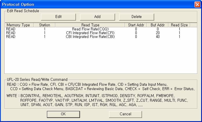<Ç¥ 5> UFL-20 Flow Meter Series Åë½Å µå¶óÀ̹ö¿¡ »ç¿ëµÇ´Â ¼³Á¤ÀÎÀÚ µ¥ÀÌÅÍ ÀԷ¹æ¹ý