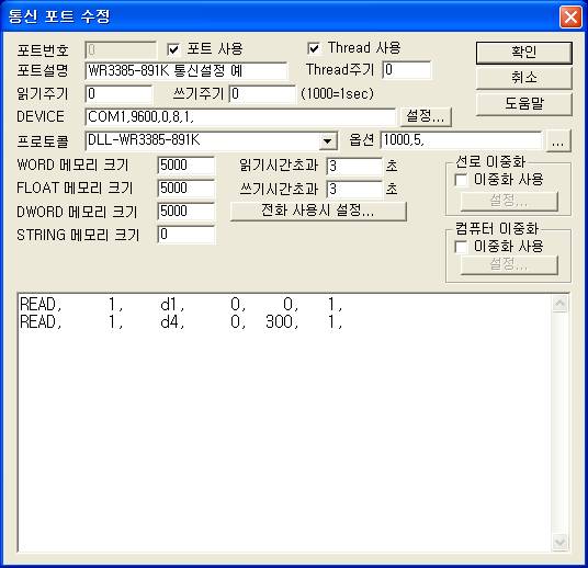 PORT : 0, STATION : 1, ADDRESS:0160, EXTRA1 : c8, EXTRA2 : 1 À̶ó°í ¼³Á¤Çϰí 5000 ÀÇ ¾Æ³¯·Î±× °ªÀ» Ãâ·ÂÇϸé WR3385ÀÇ 1¹ø LCU, 60¹ø Group, 1¹ø Point ±×·ì µ¥ÀÌÅÍÀÇ ¼³Á¤ °ªÀ» WORD ¸Þ¸ð¸® 5000 ¹øÁöºÎÅÍ 256 (°³º°»óÅ µ¥ÀÌÅÍ) + 32 (Á¶±¤¼³Á¤ µ¥ÀÌÅÍ) + 32 (Áö¿¬¼³Á¤ µ¥ÀÌÅÍ) °³ ÀÐ¾î¼ WR3385 Àåºñ¿¡ ¼Û½ÅÇÑ´Ù. ( µ¥ÀÌÅÍ Çü½ÄÀº <Ç¥ 6> ÂüÁ¶ )