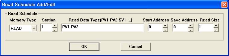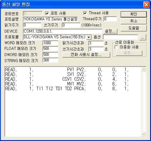 PORT : 0 STATION : 1 ADDRESS : 0020 EXTRA1 : PV1 PV2 SV1 SV2 MV1 MV2 EXTRA2 : 1 ·Î ¼³Á¤ÇÏ°í µðÁöÅÐ/¾Æ³¯·Î±× Ãâ·ÂÀ» Çϸé YS Series ÀåºñÀÇ PV1, PV2, SV1, SV2, MV1, MV2 °ªÀ» ÀÐ¾î¼ 20 ~ 25 ¹øÁöÀÇ WORD, DWORD, FLOAT Åë½Å ¸Þ¸ð¸®¿¡ ÀÐÀº °ªÀ» ÀúÀåÇÑ´Ù.