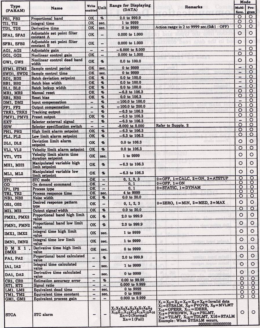 | SYSA | System alarm | - | _ | X1 = Input over range X2 = Output current open X3 = Invalid data X4 = Invalid data X5 = Computed over flow X6 = Erased RAM memory X7 = Invalid data X8 = Invalid data |