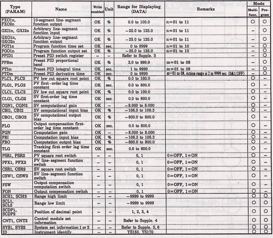 <Ç¥ 1-2> YOKOGAWA YS150, YS170 ¸ðµ¨ÀÇ µ¥ÀÌÅÍ Á¾·ù¿Í ³»¿ë