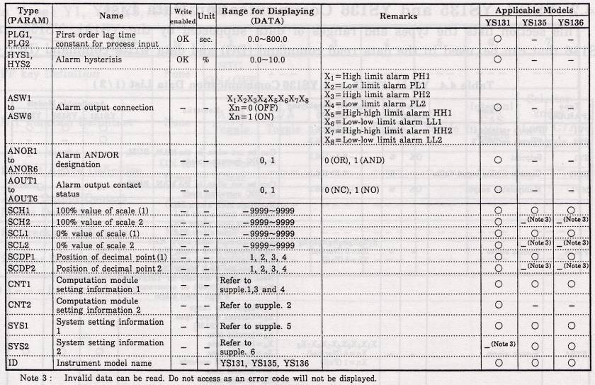 <Ç¥ 4> YOKOGAWA YS150, YS170 ¸ðµ¨ÀÇ SYS1 µ¥ÀÌÅÍ ³»¿ë
