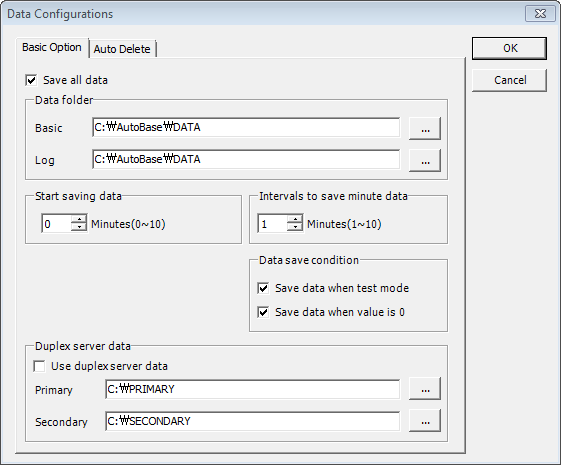 Intervals to save minute data : It increases the speed for data save by setting the time interval of minute data, as every 1~10 minute, in case of project which has many tags.