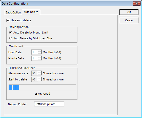 Month limit : You can set time limit for storage duration of hour data and minute data as between 1 and 60 month.(Default = Hour Data : 12, Minute Data : 1)