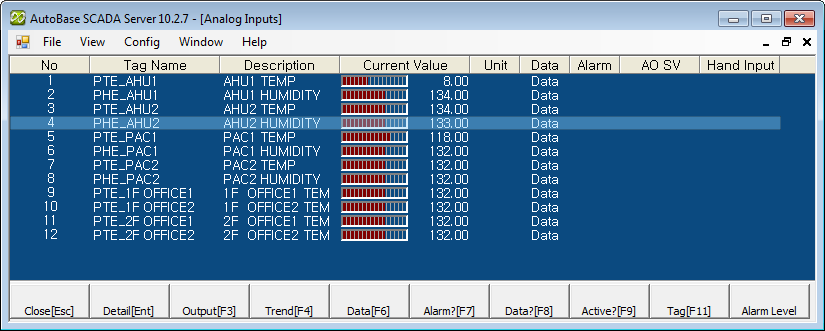 You can see all analog input tag's tag name, description, current value, unit, whether to save data, whether to use alarm, SV/Out1(AO SV) and whether to use hand input by using analog inputs screen.