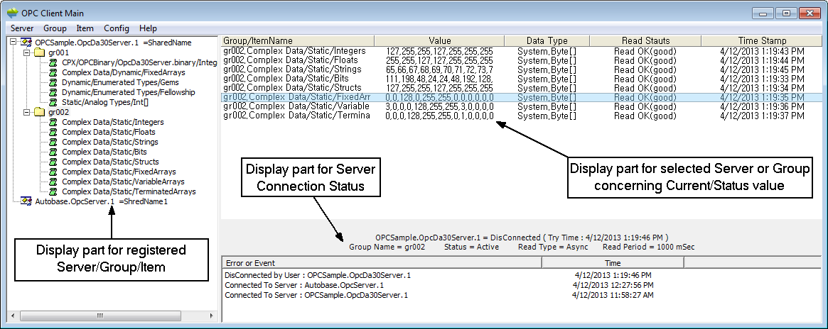 Current Item Value/Read Status display area : It shows Group/Item name, current Value, Data Type, Read Status and Time Stamp etc. (Upper list)