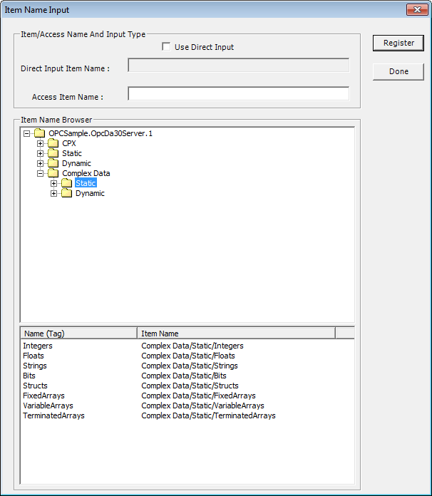 Item Name Browser : It displays the OPC Server name at the top of tree, and subtrees are displays an each group. (These group is not OPC Client group)