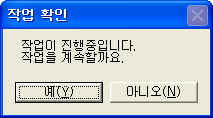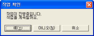 retn = @MessageBox("ÀÛ¾÷ÀÌ ÁøÇàÁßÀÔ´Ï´Ù.\nÀÛ¾÷À» °è¼ÓÇÒ±î¿ä.", "ÀÛ¾÷ È®ÀÎ", MB_YESNOCANCEL);