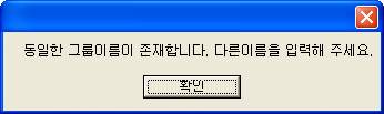 ¸¸¾à ±×·ì µî·Ï/¼öÁ¤ ´ëÈ»óÀÚ¿¡¼ ÀÌ¹Ì µî·ÏµÈ ±×·ìÀ̸§À» ÀÔ·ÂÇÏ¿© µî·Ï/¼öÁ¤Çϸé <±×¸² 2>¿Í °°Àº ¸Þ½ÃÁö¸¦ Ç¥½ÃÇÑ´Ù.