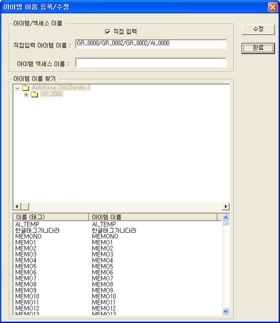 µÈ Á÷Á¢ÀÔ·Â ¾ÆÀÌÅÛ À̸§ ¿¡µðÅÍ¿¡ OPC ¼¹ö¿¡¼ Á¦°ø(µî·ÏµÈ)ÇÏ´Â ¾ÆÀÌÅÛ À̸§°ú ¿¢¼¼½º À̸§À» ¼öÁ¤ÇÑ ÈÄ