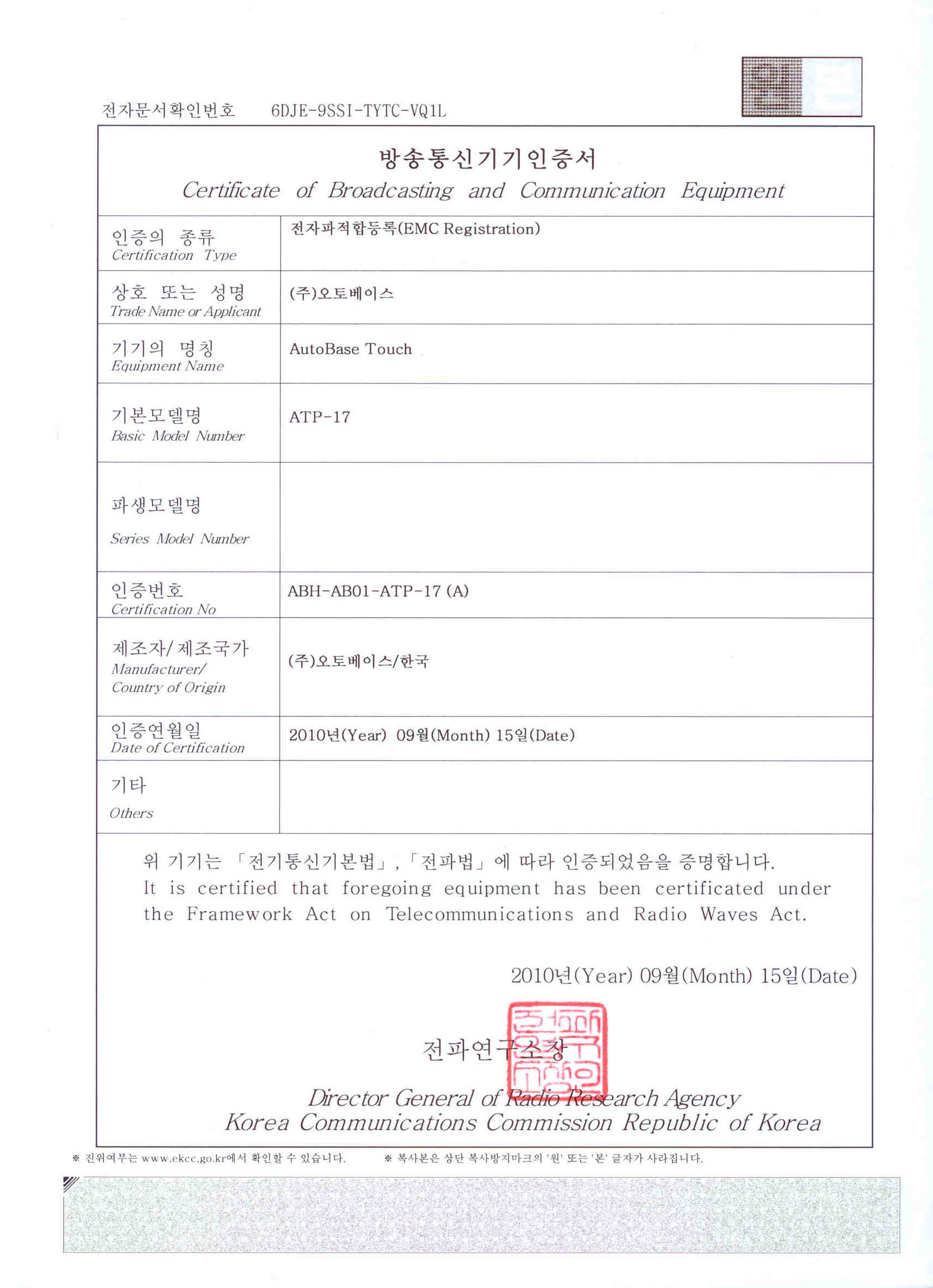 오토베이스 터치 방송통신기기인증서 (KCC) 인증의 종류 : 전자파적합등록 상호 : (주)오토베이스 기기의 명칭 : AutoBase Touch 기본모델명 : ATP-17 인증번호 : ABH-AB01-ATP-17 (A) 제조자/제조국가 : (주)오토베이스/한국 인증연월일 : 2010-9-15 인증기관 : 전파연구소 첨부파일의 원본이미지 참고 바랍니다.