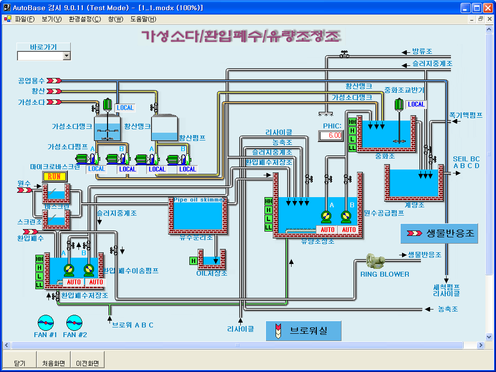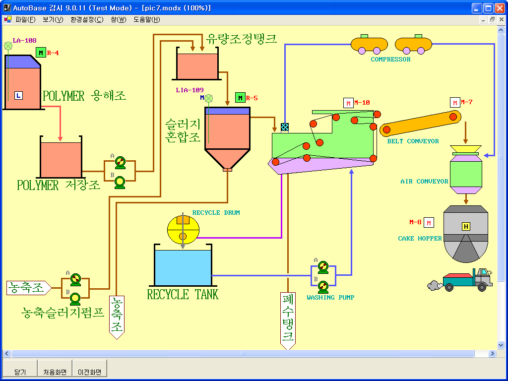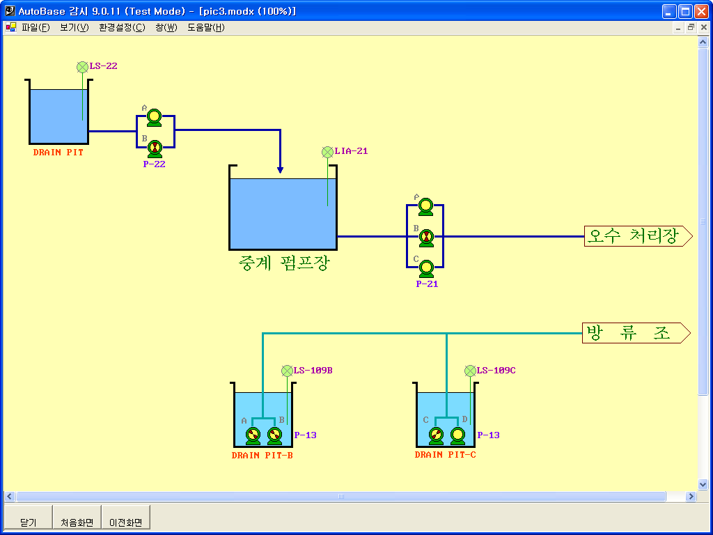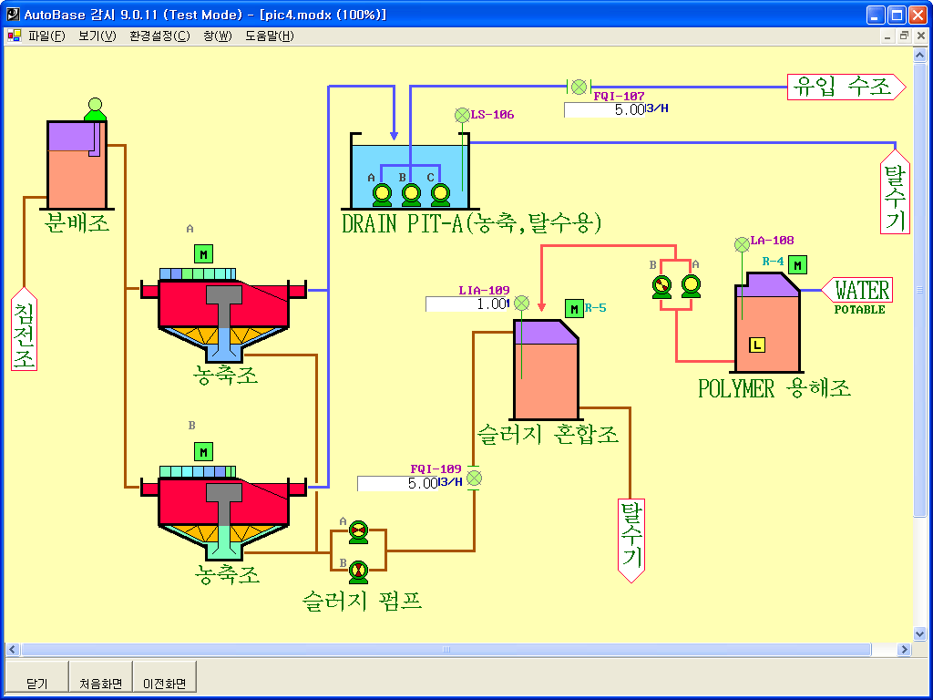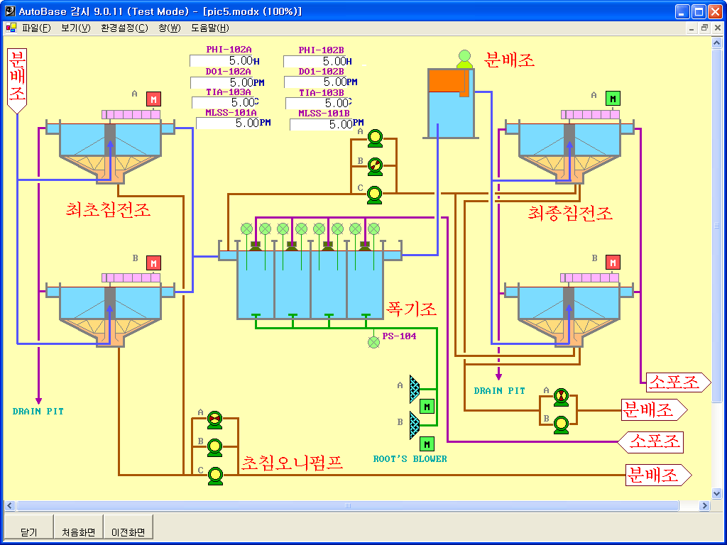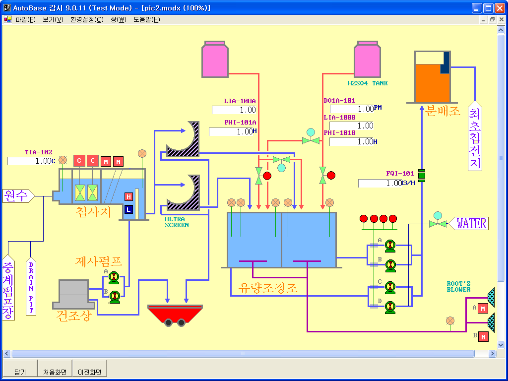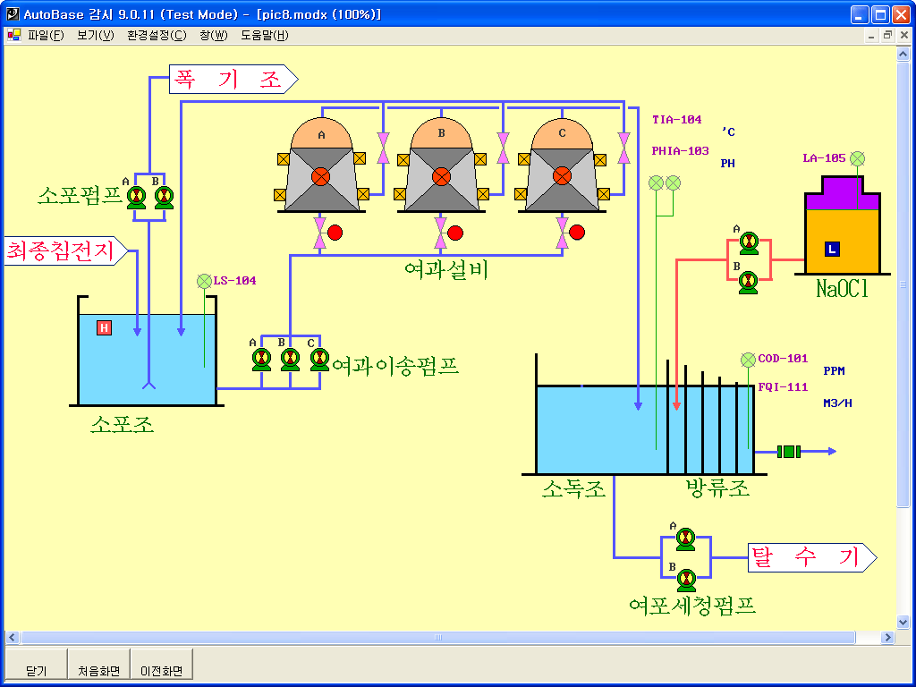 폐수 처리 시스템은 침사 약품투입, 최초 침전, 폭기, 죄종침전, 슬러지농축, 소독, 방류의 일련의 과정을 자동적으로 처리하고 감시하는 시스템이다.