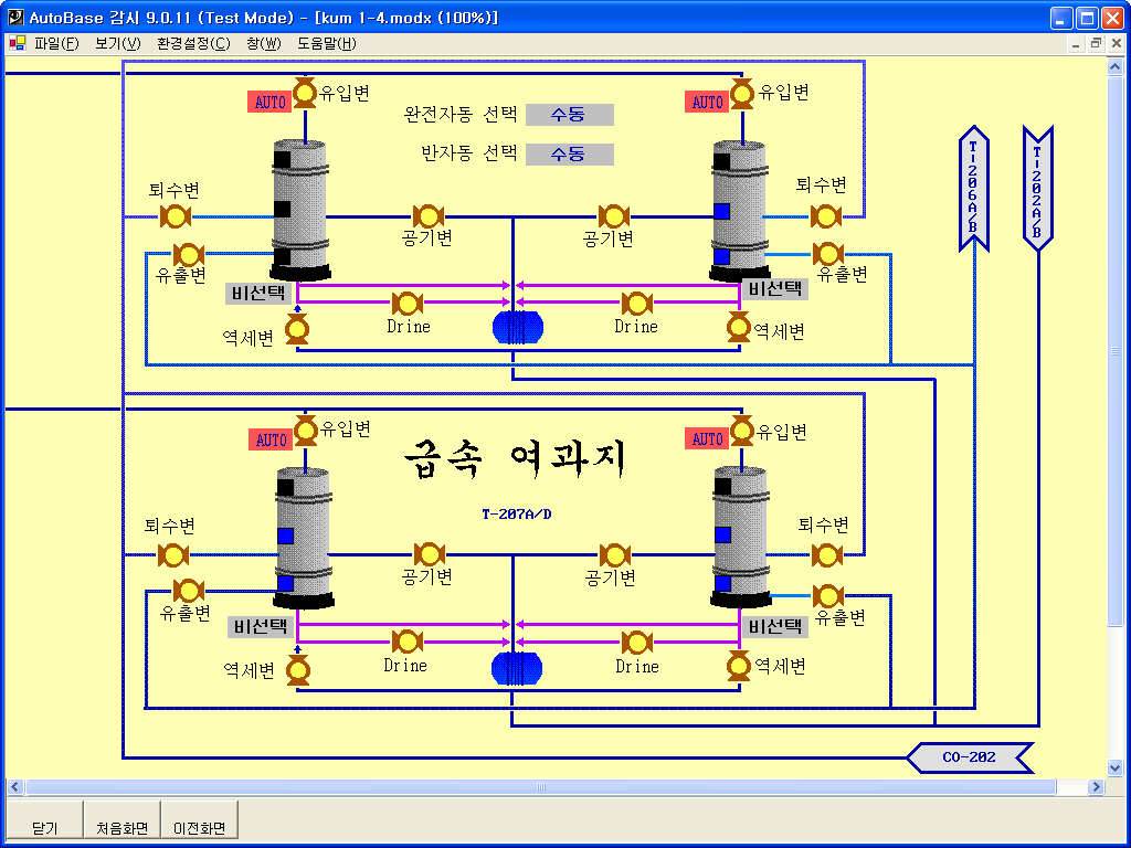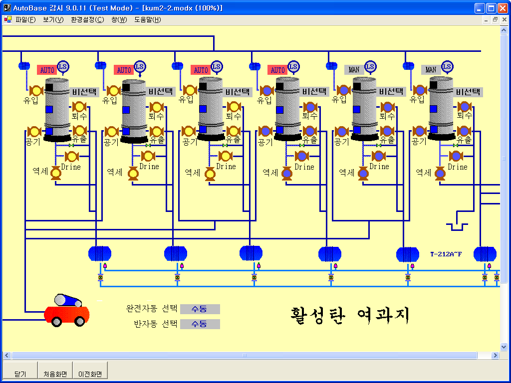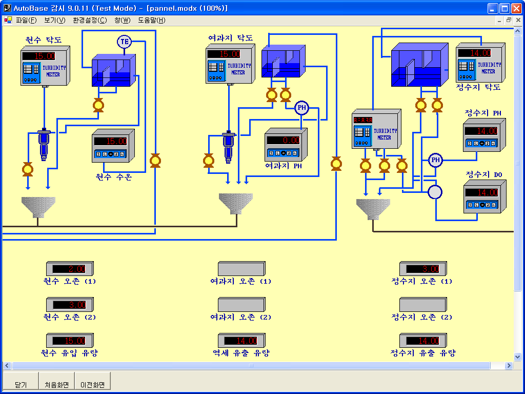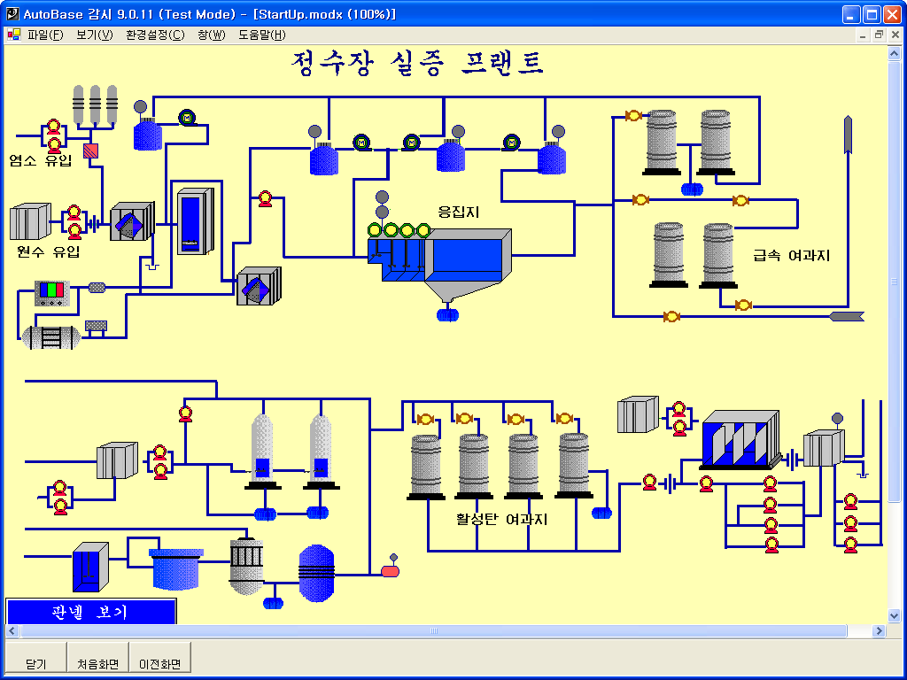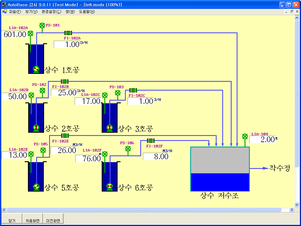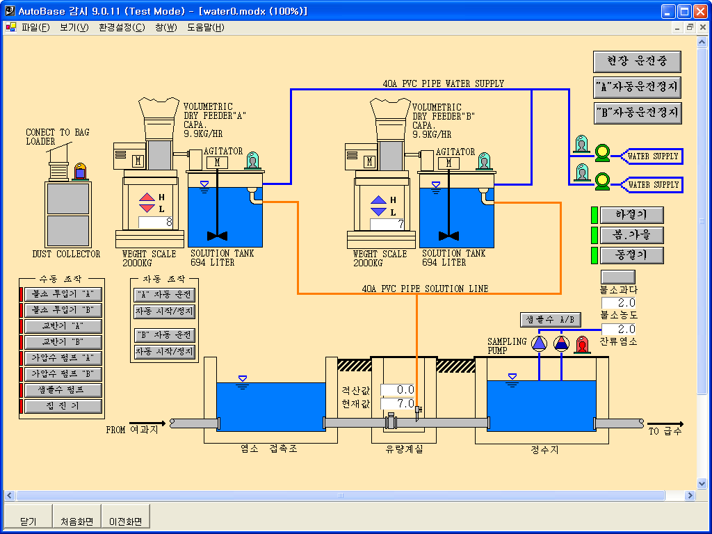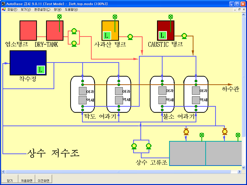 상소처리 시스템은 원소를 상수로 사용할 수 있도록 침전, 여과, 약품 처리 등의 일련의 과정을 자동으로 처리해주고 감시하는 시스템이다. 각 공정별로 단위 콘트롤 프로그램이 동작되고 감시된 데이터들은 시간/일별/월별로 자동으로 프린터되어 관리자에게 전달된다. 각 구역별로 감시를 하고 오토베이스 서버 컴퓨터에서는 감시된 데이타를 네트워크와 전용선로를 이용하여 종합 감시한다.